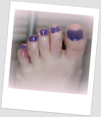 You see, a terrible home pedicure can make a huge difference to the appearance of a broken toe. The viewer is no longer horrified by the swollen, bruised appearance of the annoying little blighter. The bright purple nail polish, inexpertly applied, draws the eye away from the wound and leaves the viewer in doubt of one's sanity rather than one's degree of injury.